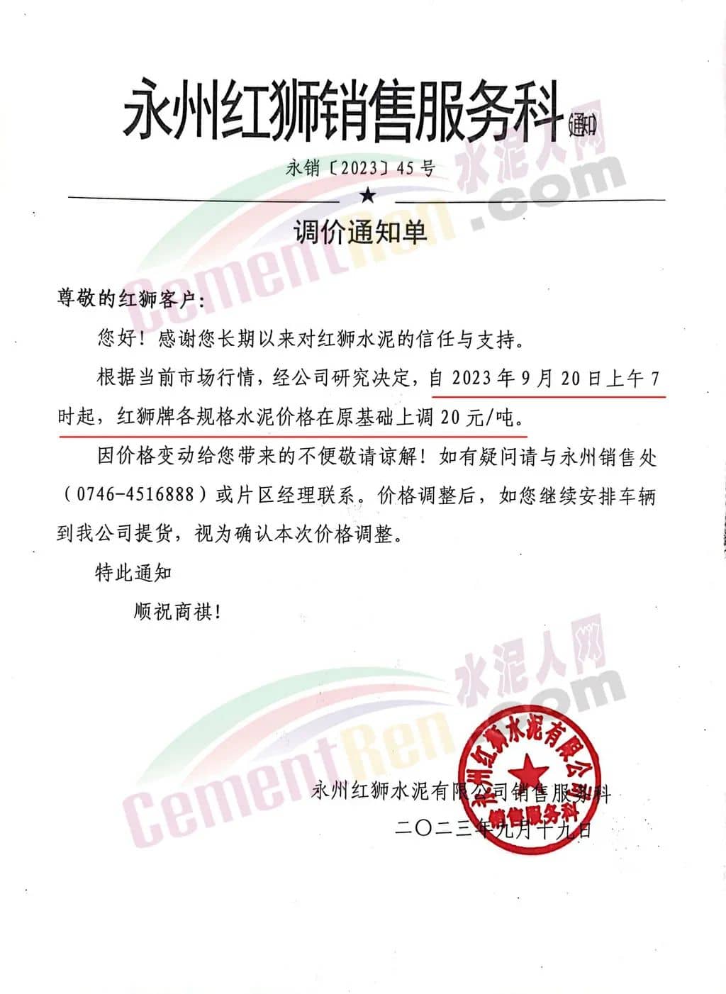 紅獅水泥旗下永州紅獅、寧遠(yuǎn)紅獅、衡陽(yáng)紅獅、永州蓮花水泥、康達(dá)(湖南)水泥等多家企業(yè)通知,根據(jù)當(dāng)前市場(chǎng)行情,經(jīng)公司研究決定,自2023年9月20日上午7時(shí)起各規(guī)格水泥價(jià)格在原基礎(chǔ)上上調(diào)20元/噸。