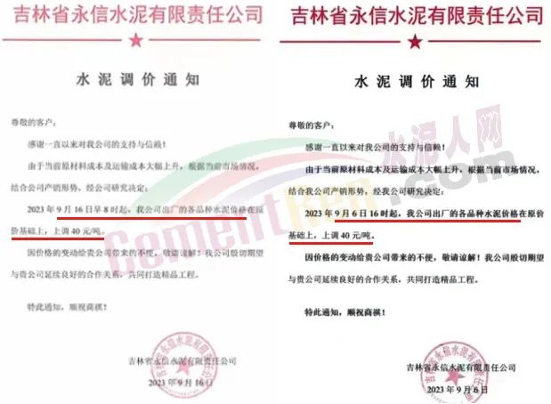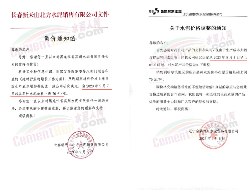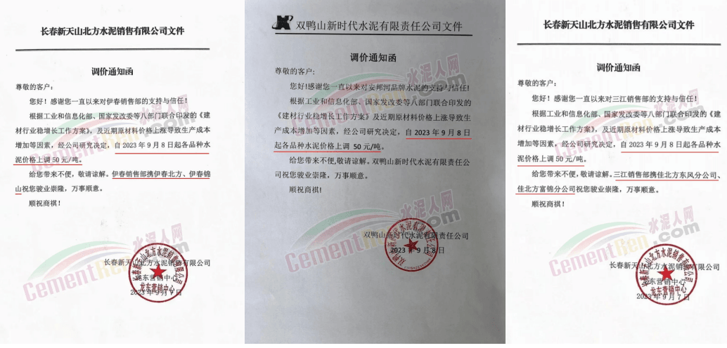 9月8日,雙鴨山新時(shí)代水泥、長(zhǎng)春新天山北方水泥龍東營(yíng)銷(xiāo)中心伊春銷(xiāo)售部、三江銷(xiāo)售部分別通知,各品種水泥價(jià)格上調(diào)50元/噸。