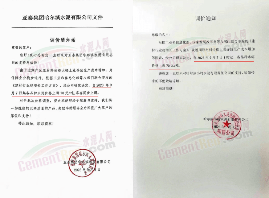 9月7日,亞泰集團(tuán)哈爾濱水泥、哈爾濱小嶺水泥通知,各品種水泥價(jià)格上調(diào)70元/噸。