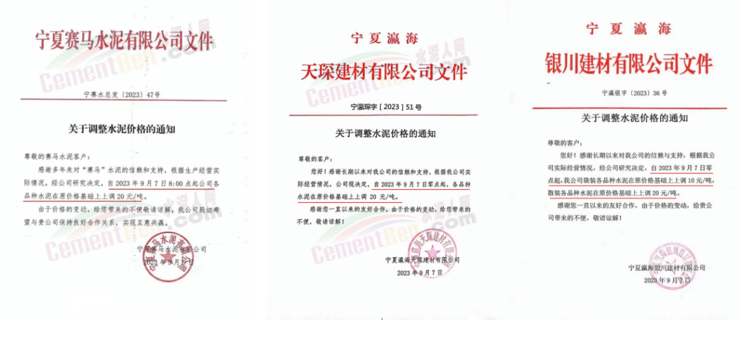 寧夏賽馬、瀛海天琛建材、瀛海銀川建材等企業(yè)上調(diào)水泥價(jià)格20元/噸