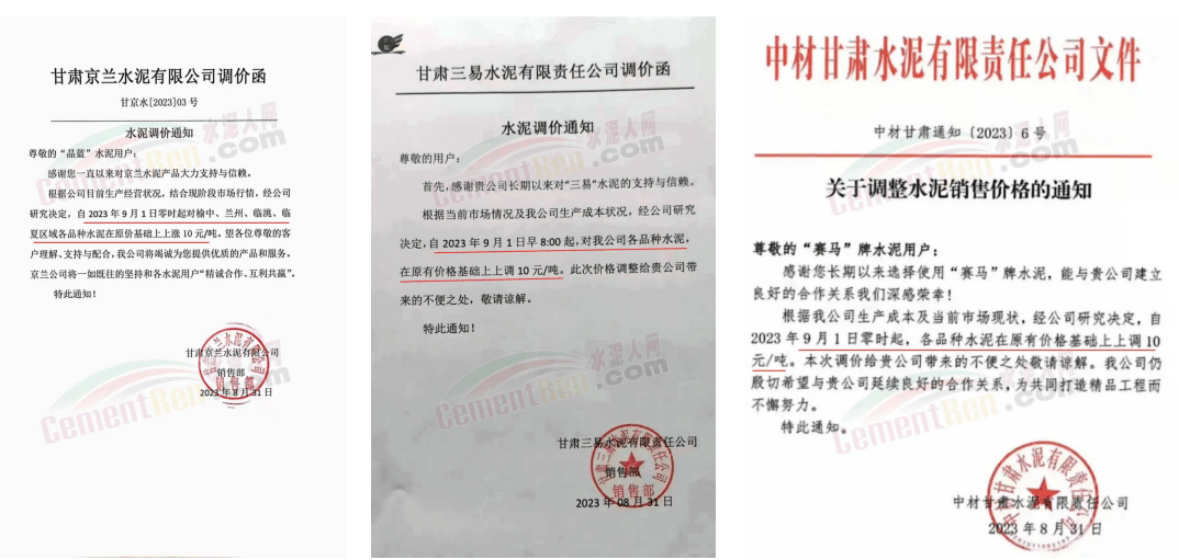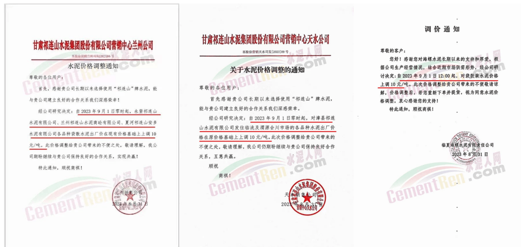 9月1日,甘肅祁連山水泥蘭州公司通知永登祁連山水泥、蘭州祁連山水泥商砼、夏河祁連山安多水泥各品種水泥出廠價(jià)在現(xiàn)有價(jià)格基礎(chǔ)上上調(diào)10元/噸。同日,臨夏海螺水泥、中材甘肅水泥、甘肅京蘭水泥、甘肅三易水泥等企業(yè)通知上調(diào)榆中、蘭州、臨洮、臨夏等多區(qū)域水泥報(bào)價(jià)10~20元/噸。