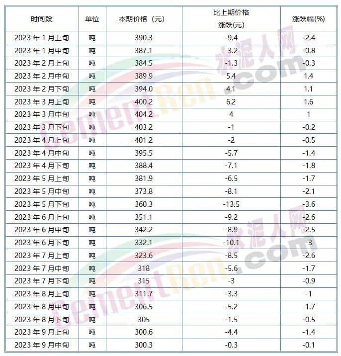 從近期國家統(tǒng)計(jì)局公布的數(shù)據(jù)可見,流通領(lǐng)域水泥價(jià)格連續(xù)下跌已放緩。流通區(qū)域普通硅酸鹽水泥(P.O42.5散裝)9月中旬報(bào)價(jià)300.3元/噸,為年內(nèi)最低價(jià)。且從3月下旬開始連續(xù)18期下跌,從5月上旬開始連續(xù)14期創(chuàng)年內(nèi)低點(diǎn)。較本年高點(diǎn)404.2元/噸,相差103.9元/噸??上驳氖墙诘照?.1%,為年內(nèi)最低跌幅,這也意味著即將回升的趨勢(shì)。