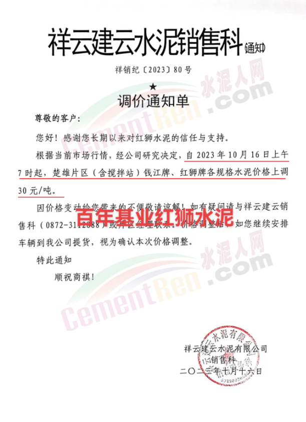 紅獅水泥旗下祥云建云水泥有限公司銷售科通知,根據(jù)當(dāng)前市場行情,經(jīng)公司研究決定,自2023年10月16日上午7時起,楚雄片區(qū)(含攪拌站)錢江牌、紅獅牌各規(guī)格水泥價格上調(diào)30元/噸。