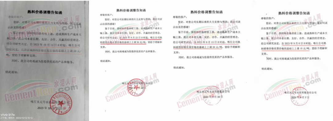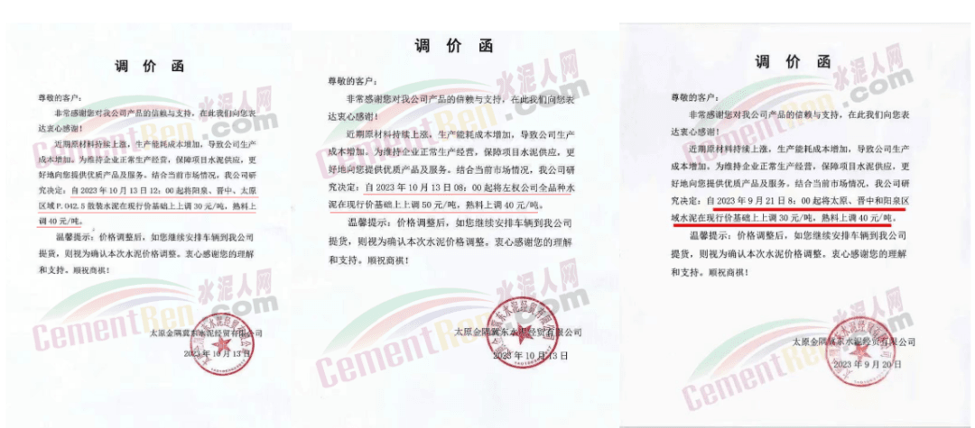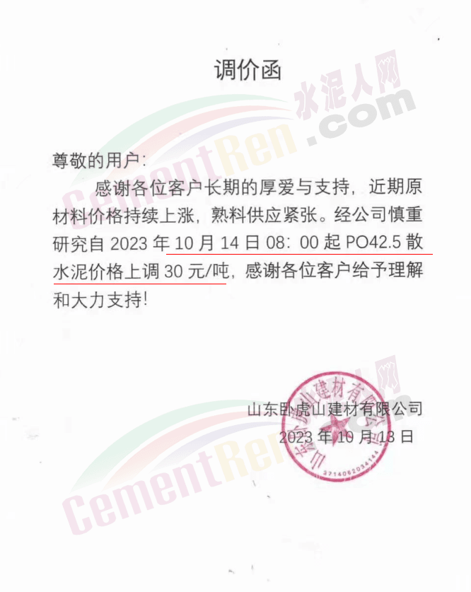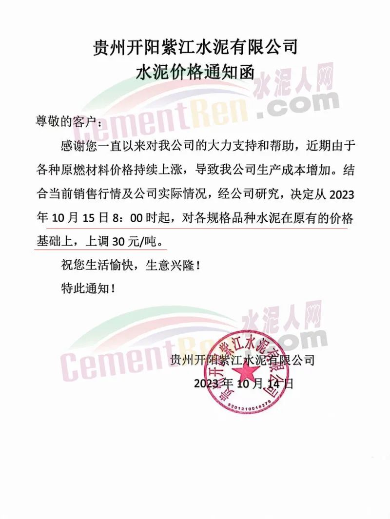 畢節(jié)賽德水泥有限公司通知,由于原材料價格持續(xù)上漲,導(dǎo)致公司生產(chǎn)成本增加,經(jīng)公司研究決定,自2023年10月16日零點起,對所有區(qū)域各品種水泥出廠價格在原有價格基礎(chǔ)上上調(diào)30元/噸。