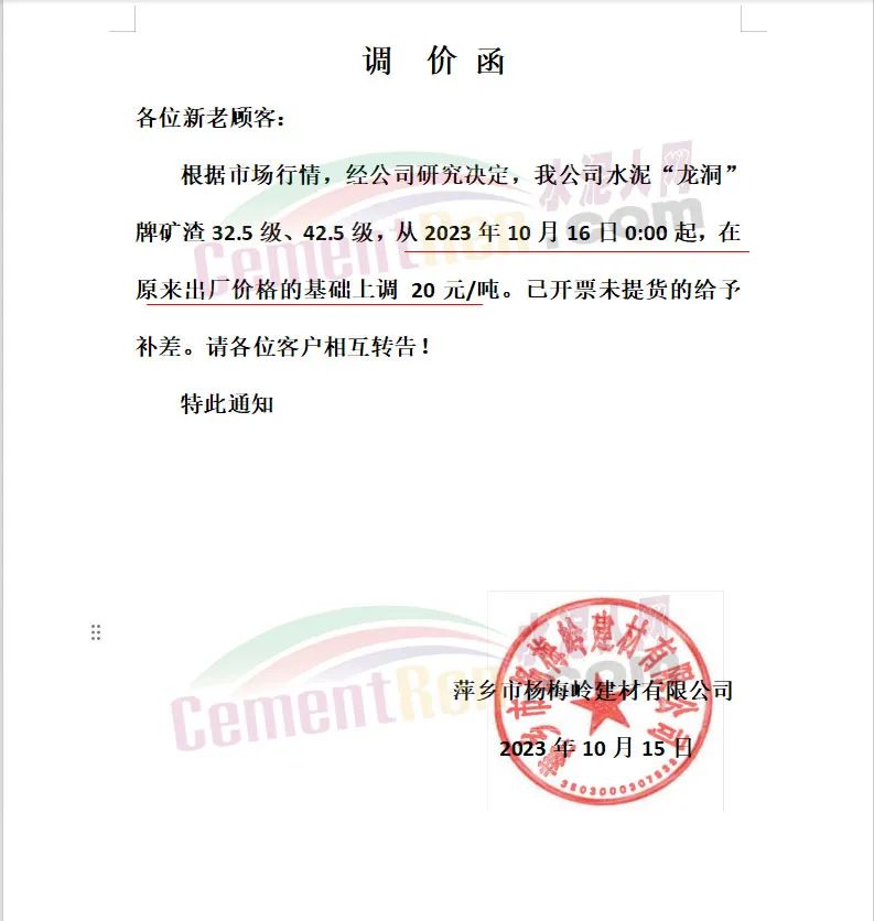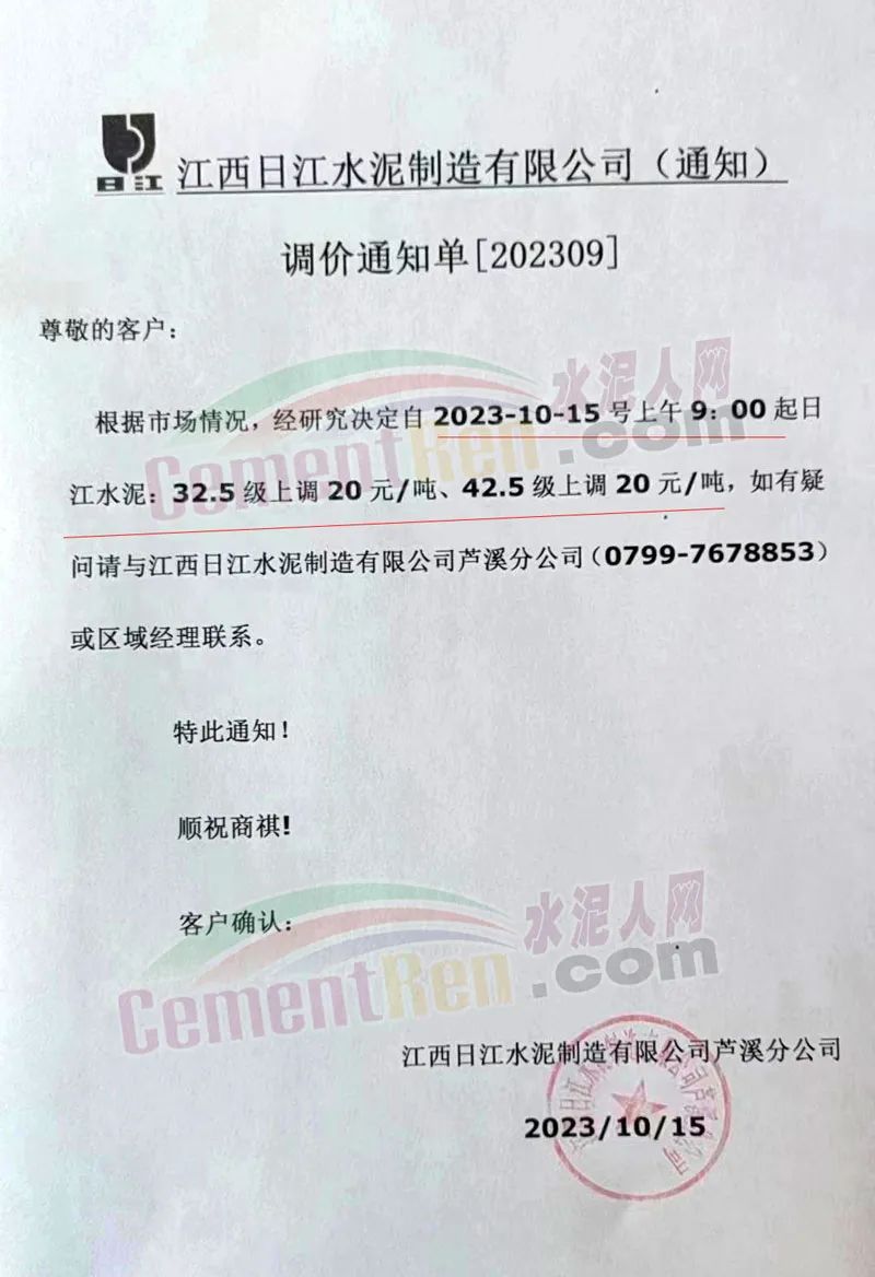 江西日江水泥制造有限公司通知,根據(jù)市場情況,經(jīng)研究決定自2023年10月15日上午9時起各標(biāo)號水泥價格上調(diào)20元/噸。