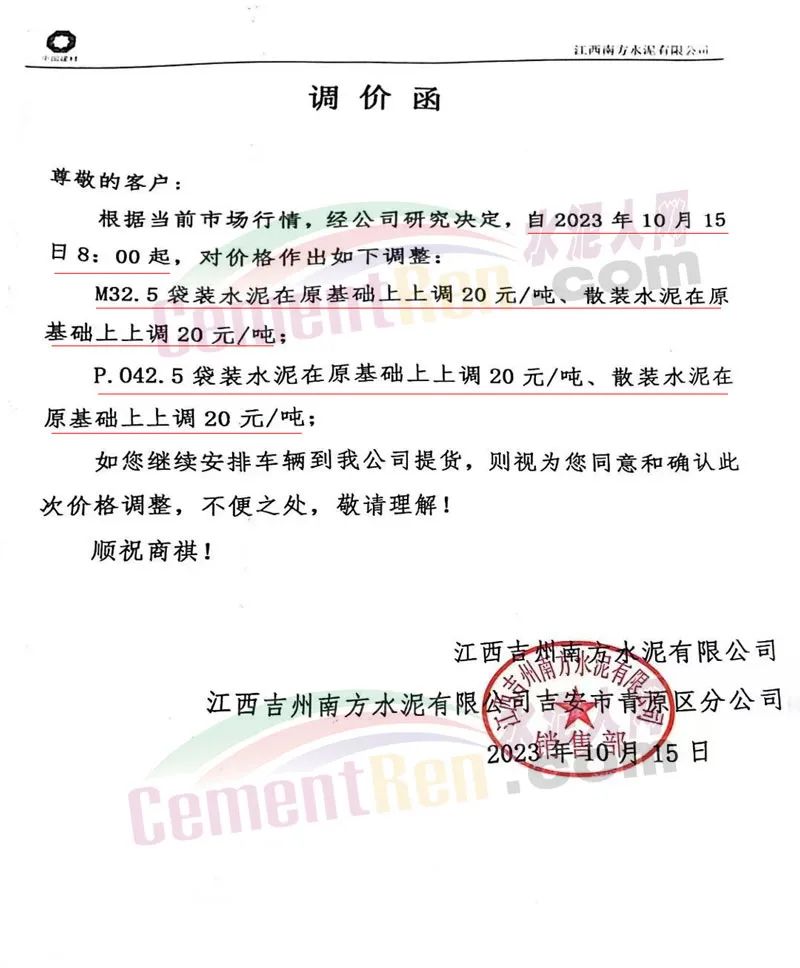 江西吉州南方水泥吉安青原區(qū)分公司通知,根據(jù)當(dāng)前市場行情,經(jīng)公司研究決定,自2023年10月15日8時起,各標(biāo)號水泥上調(diào)20元/噸。