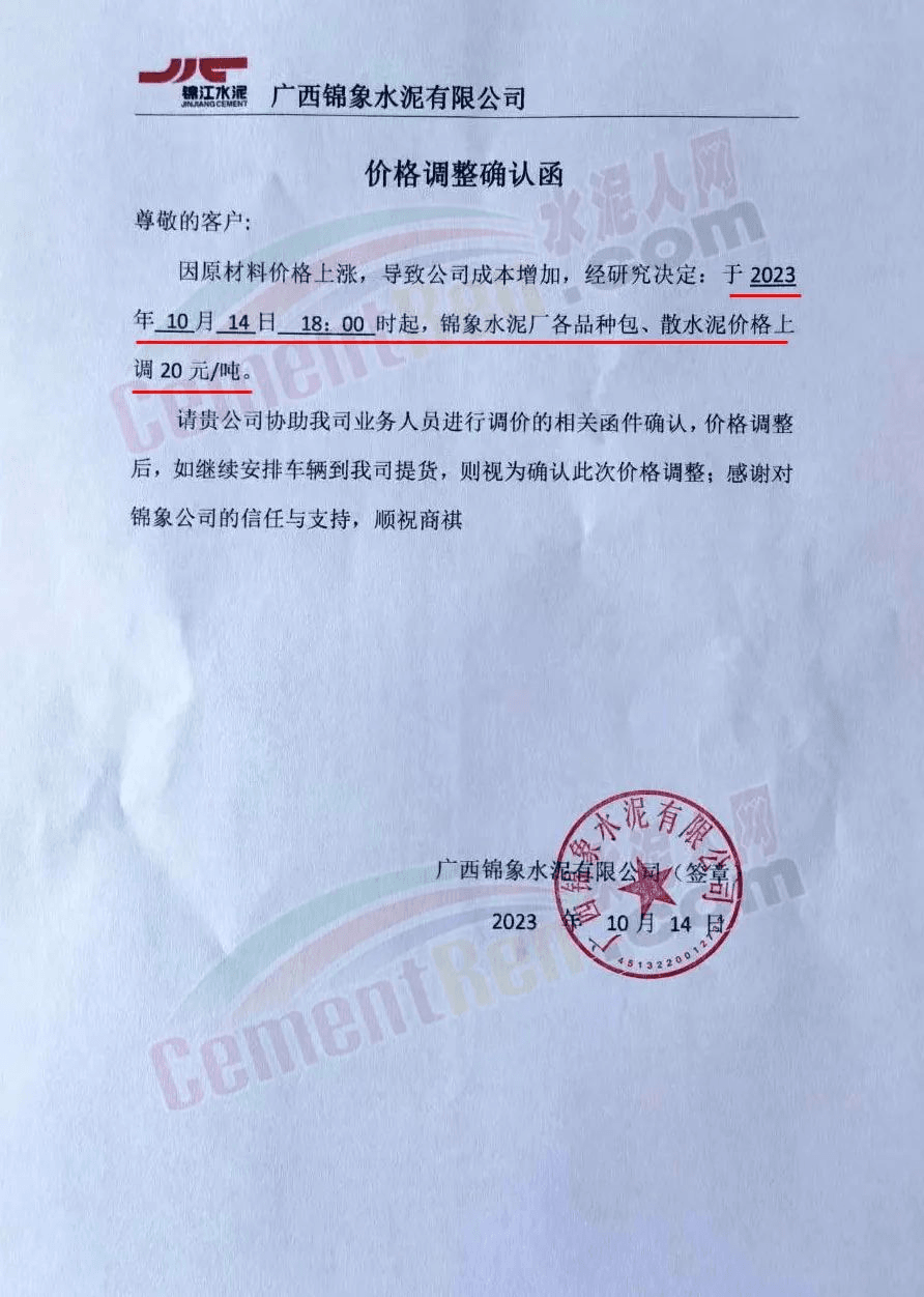 廣西新建線企業(yè)錦象水泥通知,因原材料價格上漲,導(dǎo)致公司成本增加,經(jīng)研究決定,于2023年10月14日起,各品種包、散水泥價格上調(diào)20元/噸。