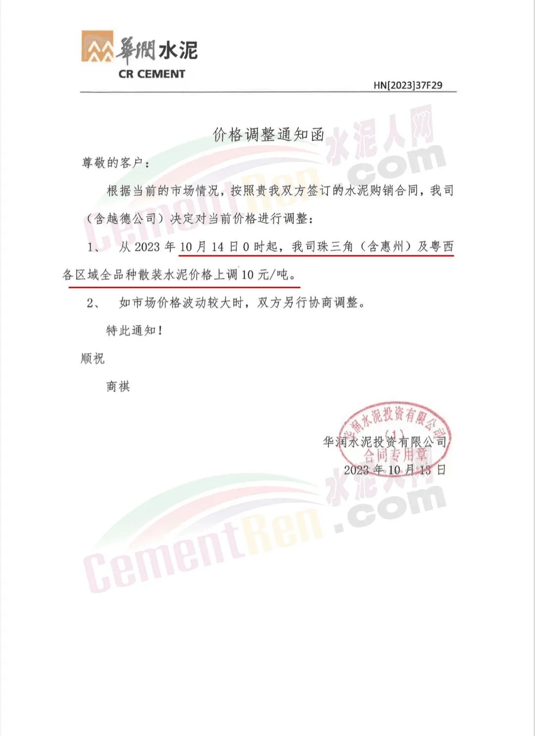 此前在各區(qū)域建立直銷機(jī)制,并報出市場較低價的華潤水泥通知,自10月14日起,公司珠三角(含惠州)及粵西各區(qū)域全品種散裝水泥價格上調(diào)10元/噸。