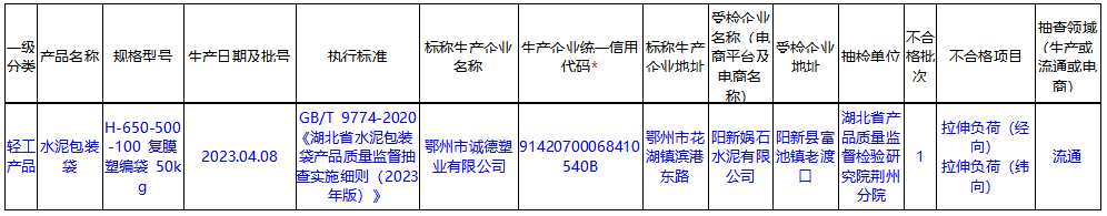 湖北省通報陽新媧石水泥一批次水泥包裝袋不合格