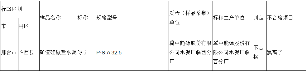 9月4日,河北省市場監(jiān)督管理局通報標(biāo)稱生產(chǎn)單位為冀中能源股份有限公司水泥廠臨西分廠的1批次“詠寧”牌礦渣硅酸鹽水泥(PSA.32.5)氯離子項目不合格。
