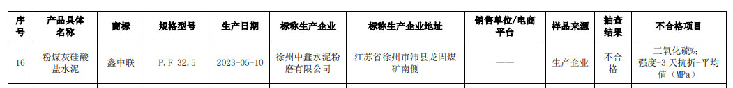 江蘇通報,1批次水泥三氧化硫%、強(qiáng)度不合格