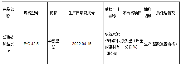 2023年8月16日,湖北省市場監(jiān)管局網(wǎng)站通報,華新水泥(鶴峰)民族建材有限公司一批次P.O42.5水泥燒失量不合格。