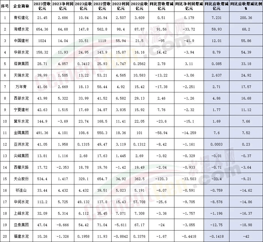 今年上半年各企業(yè)公布的半年報可見,20家上市企業(yè)中12家應(yīng)收賬款增加,占比達60%。其中海螺水泥2023年上半年同比2022年同期應(yīng)收賬款及票據(jù)增加59.93億元,增幅達68.2%。同期營業(yè)收入增加91.56億元,凈利潤減少33.72億元,增收不增利的情況明顯。