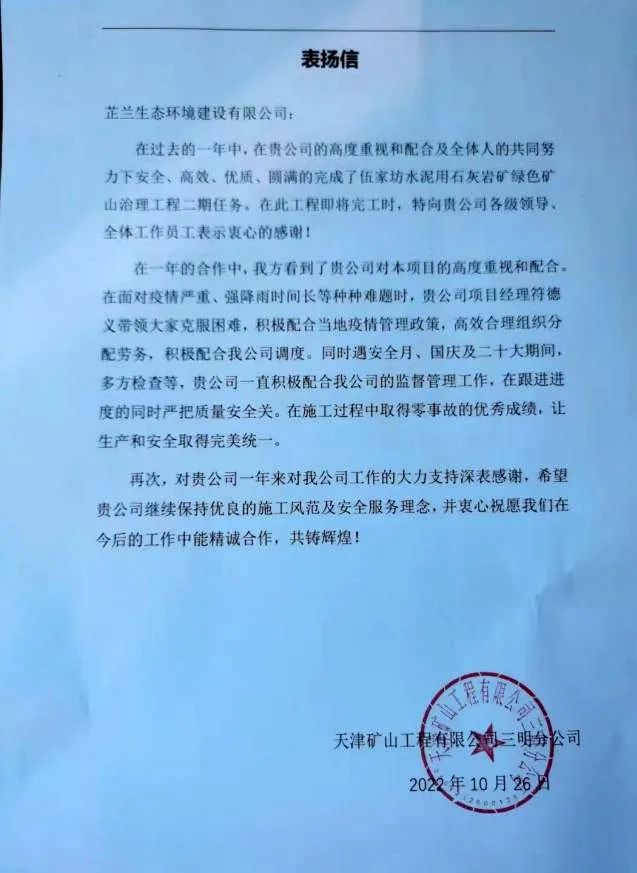 2022年,芷蘭生態(tài)在浙江桐廬縣桐君街道閬苑村,復綠礦區(qū)最終邊坡120-145米邊坡、20個平臺復綠、80-120米邊坡復綠。中建材旗下天津礦山工程有限公司對項目的成果給予了表揚信,這表明該項目在改善地質環(huán)境和生態(tài)環(huán)境方面取得了顯著成就。
