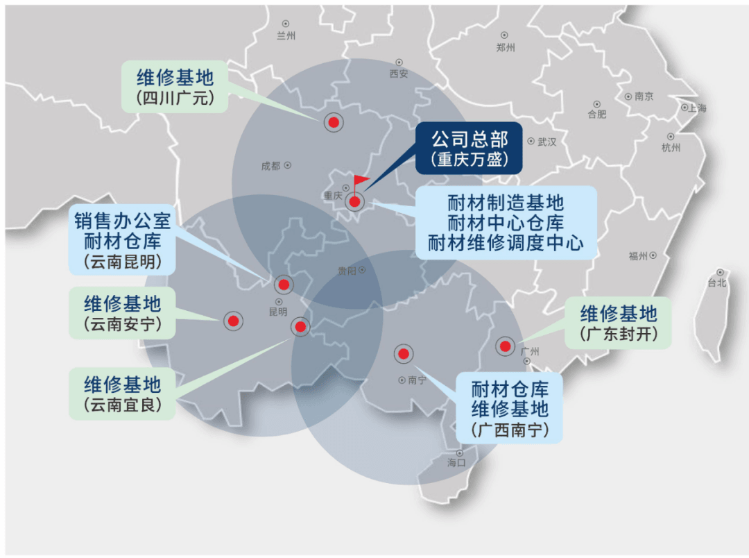 據(jù)水泥人網(wǎng)了解,重慶良友總部設(shè)在重慶萬(wàn)盛,同時(shí)設(shè)立耐材制造基地、耐材中心倉(cāng)庫(kù)和耐材維修調(diào)度中心。且同步在四川廣元、云南宜良、安寧、廣西南寧、廣東封開(kāi)分別建立了維修基地。在云南昆明、廣西南寧設(shè)立了耐材倉(cāng)庫(kù)。