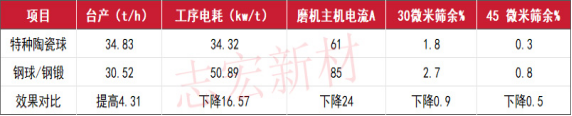 金華GF超細粉磨主要設備為3.2×13米的球磨機,磨機主電機1600kw。磨機第二倉鋼段全部更換為第三代特種陶瓷球(簡稱:特種陶瓷球,下同)后,臺產提高10%以上,電耗降低16.57度/噸,磨機主電機電流下降24A,30微米篩余下降50%以上,45微米篩余下降33%;按節(jié)省電耗計算投資回收期7-8個月,綜合考慮提高臺產和提高超細粉質量等新增經濟效益計算投資回收期5-6個月。