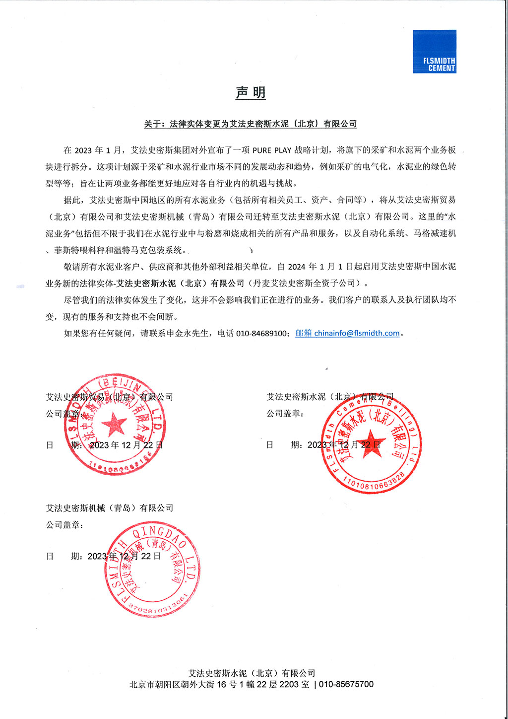 敬請所有水泥業(yè)客戶、供應(yīng)商和其他外部利益相關(guān)單位,自2024年1月1日起啟用艾法史密斯中國水泥業(yè)務(wù)新的法律實(shí)體-艾法史密斯水泥(北京有限公司(丹麥艾法史密斯全資子公司)。