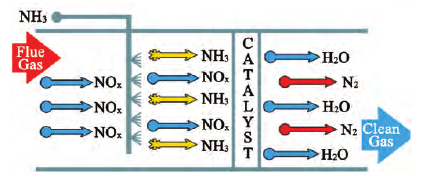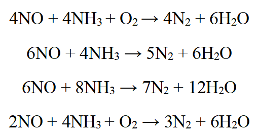 SCR技術(shù)大規(guī)模的應(yīng)用于國(guó)內(nèi)外的電力行業(yè)中,在水泥行業(yè)還未廣泛開展應(yīng)用。SCR是利用NH3與NO反應(yīng)的選擇性,選擇合適的催化劑,在350~400℃時(shí),在催化劑表面將富氧煙氣中的NO還原成N2和H2O如圖1所示。SCR化學(xué)反應(yīng)與SNCR是一樣的,只是降低了反應(yīng)溫度,提高了脫硝效率。主要反應(yīng)如下: