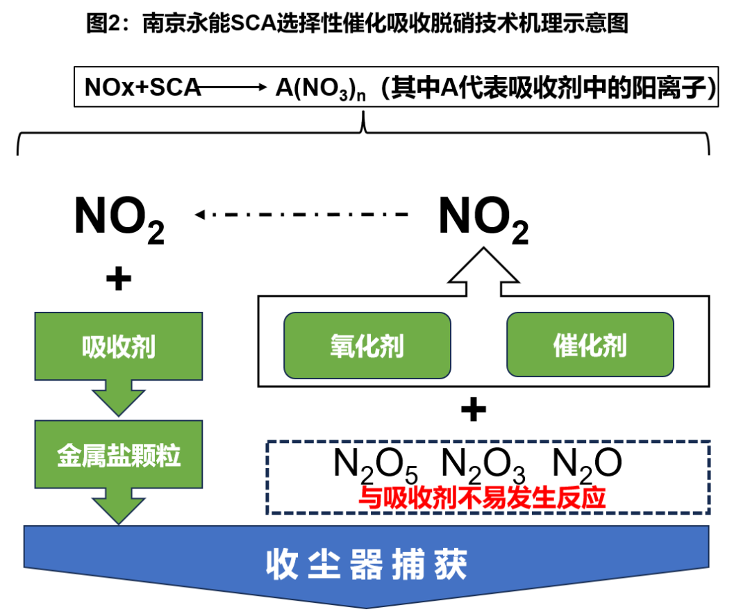 南京永能新材料有限公司開發(fā)了SCA(selective catalyst abosorption)選擇性催化吸收脫硝技術(shù)。該液體脫硝劑可以在SNCR、SCR等脫硝系統(tǒng)后端進(jìn)行輔助脫硝,無氨基,可以降低水泥企業(yè)氨水單耗和氨逃逸指標(biāo)。無氨脫硝劑的主要成分包括:催化劑、分散劑、吸收劑、氧化劑組成成。通過特定催化劑的協(xié)同作用,高價(jià)態(tài)的NO2很容易被吸收劑轉(zhuǎn)化為穩(wěn)定的硝酸鹽而固定,而NO則難以被吸收,即便被吸收也容易重新分解為NOx組分。永能公司的無氨脫硝劑中的氧化劑主要提供氧源,通過催化劑協(xié)同作用,可將氣態(tài)NOx快速且定向轉(zhuǎn)化為NO2,隨后通過吸收劑將其轉(zhuǎn)為穩(wěn)定的硝酸鹽,從而實(shí)現(xiàn)尾氣中NOx的高效去除。分散劑的主要作用是為了增加氧化劑與催化劑的溶解度,提高NOx向硝酸鹽的轉(zhuǎn)化效率。最終,生成的硝酸鹽顆粒會(huì)在收塵環(huán)節(jié)被捕捉,從而達(dá)到脫硝的目的。其反應(yīng)機(jī)理圖如下所示: