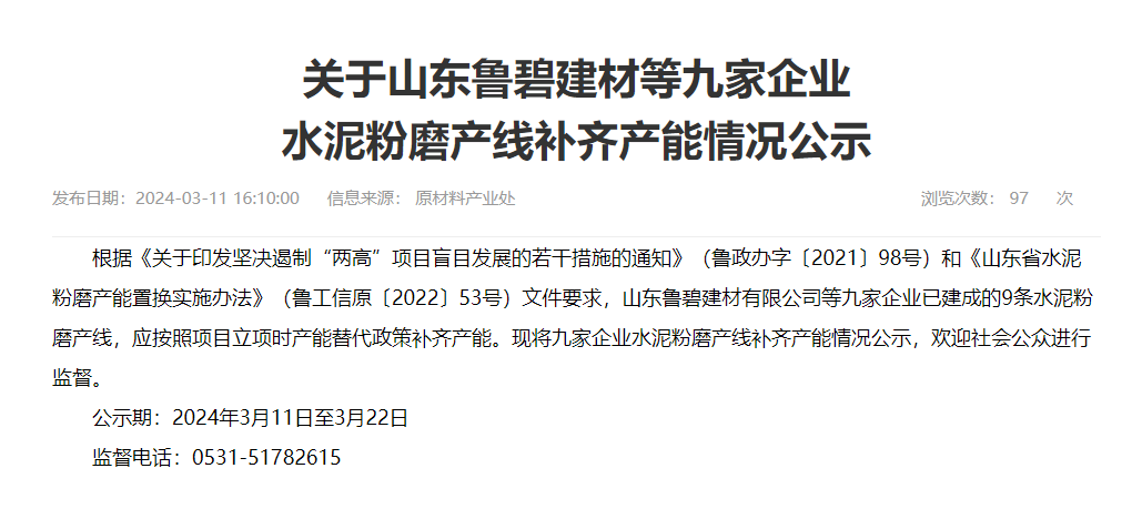 日前,山東省工信廳發(fā)布《關(guān)于山東魯碧建材等九家企業(yè)水泥粉磨產(chǎn)線補(bǔ)齊產(chǎn)能情況公示》稱,根據(jù)《關(guān)于印發(fā)堅(jiān)決遏制“兩高”項(xiàng)目盲目發(fā)展的若干措施的通知》(魯政辦字〔2021〕98號)和《山東省水泥粉磨產(chǎn)能置換實(shí)施辦法》(魯工信原〔2022〕53號)文件要求,山東魯碧建材有限公司等九家企業(yè)已建成的9條水泥粉磨產(chǎn)線,應(yīng)按照項(xiàng)目立項(xiàng)時(shí)產(chǎn)能替代政策補(bǔ)齊產(chǎn)能?,F(xiàn)將九家企業(yè)水泥粉磨產(chǎn)線補(bǔ)齊產(chǎn)能情況公示,歡迎社會(huì)公眾進(jìn)行監(jiān)督。公示期:2024年3月11日至3月22日,監(jiān)督電話:0531-51782615