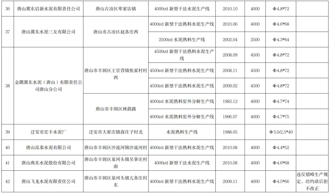其中唐山飛龍水泥有限責(zé)任公司4000t/d 新型干法熟料水泥生產(chǎn)線因違反錯(cuò)峰生產(chǎn)規(guī)定 ,經(jīng)約談后拒不改正。