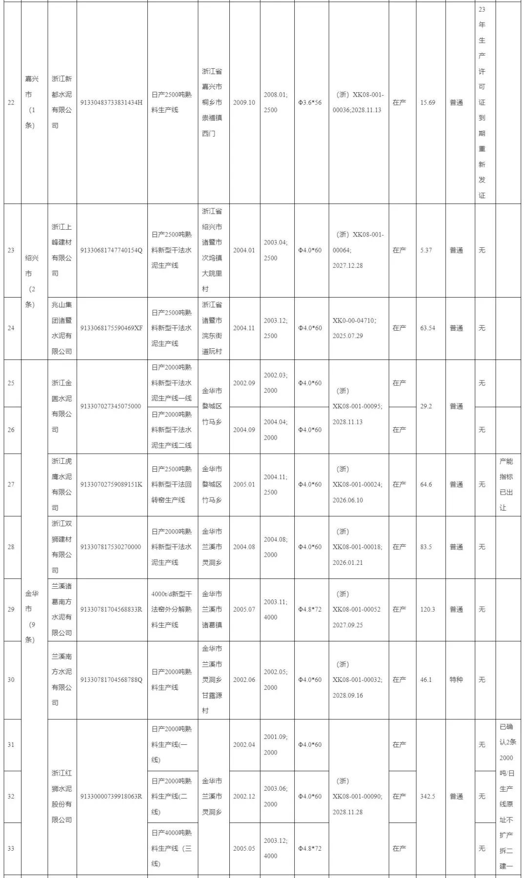 浙江省2023年度水泥熟料生產(chǎn)線清單