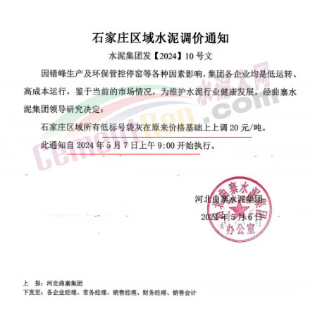 日前河北石家莊地區(qū)主要品牌企業(yè)曲寨水泥通知,因錯峰生產(chǎn)及環(huán)保管控停窯等各種因素影響,集團各企業(yè)均是低運轉(zhuǎn)、高成本運行,鑒于當前的市場情況,為維護水泥行業(yè)健康發(fā)展,經(jīng)曲寨水泥集團領(lǐng)導研究決定,自2024年5月7日上午9:00開始石家莊區(qū)域所有低標號袋灰在原來價格基礎(chǔ)上上調(diào)20元/噸。
