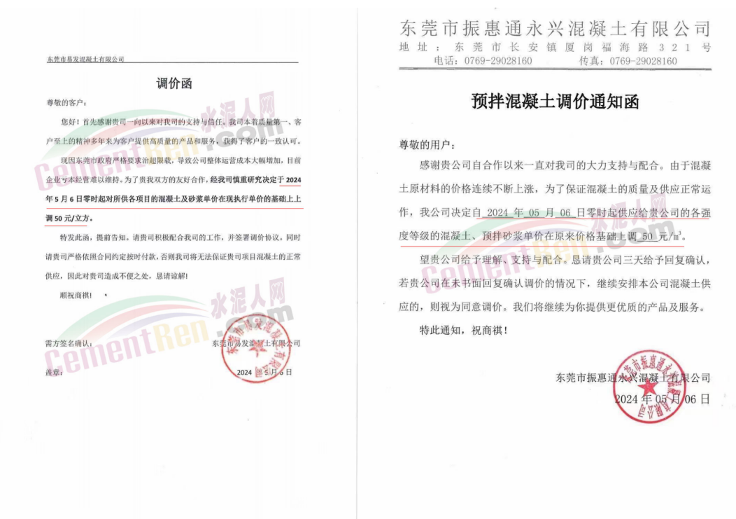 同期,廣東東莞多家混凝土企業(yè)通知上調(diào)產(chǎn)品報價50元/方。東莞市新建混凝土有限公司調(diào)價通知稱,由于市場低迷,在原材料并未有下調(diào)的情況下,混凝土價格持續(xù)低價售賣,導致公司長時間處于虧損運營狀態(tài),結(jié)合目前情況,各強度等級混凝土、預(yù)拌砂漿價格上調(diào)50元/方。