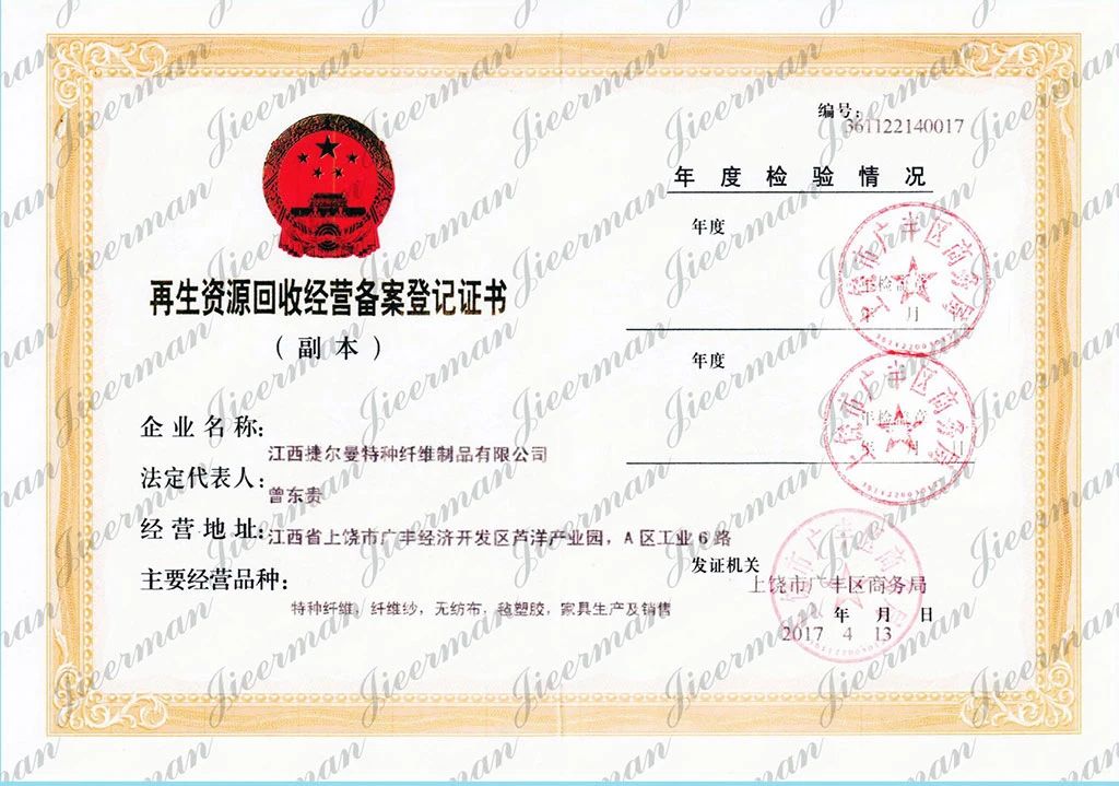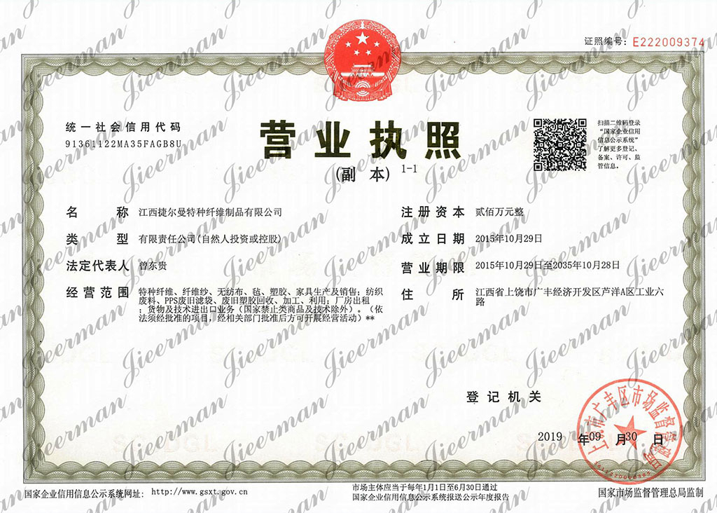 郵寄地址:江西省上饒市廣豐區(qū)廣豐經(jīng)濟(jì)開發(fā)區(qū)蘆洋A區(qū)工業(yè)六路 江西捷爾曼特種纖維制品有限公司