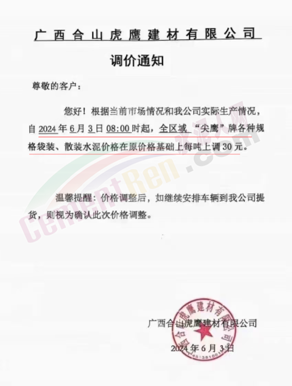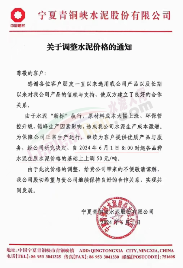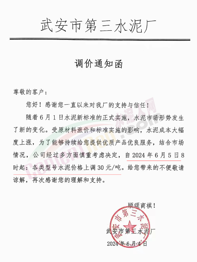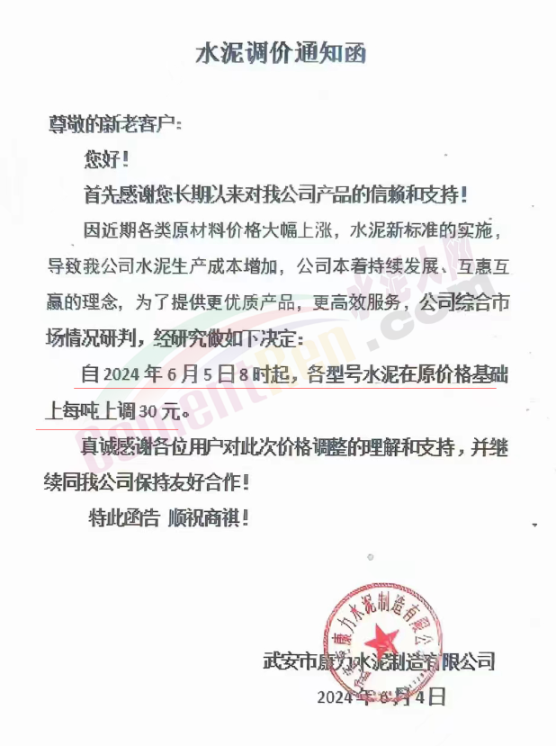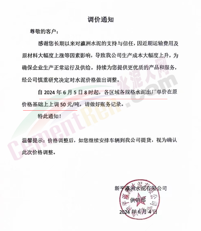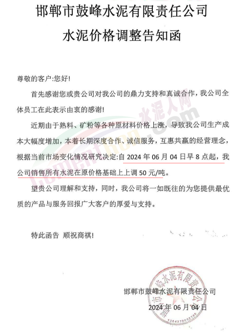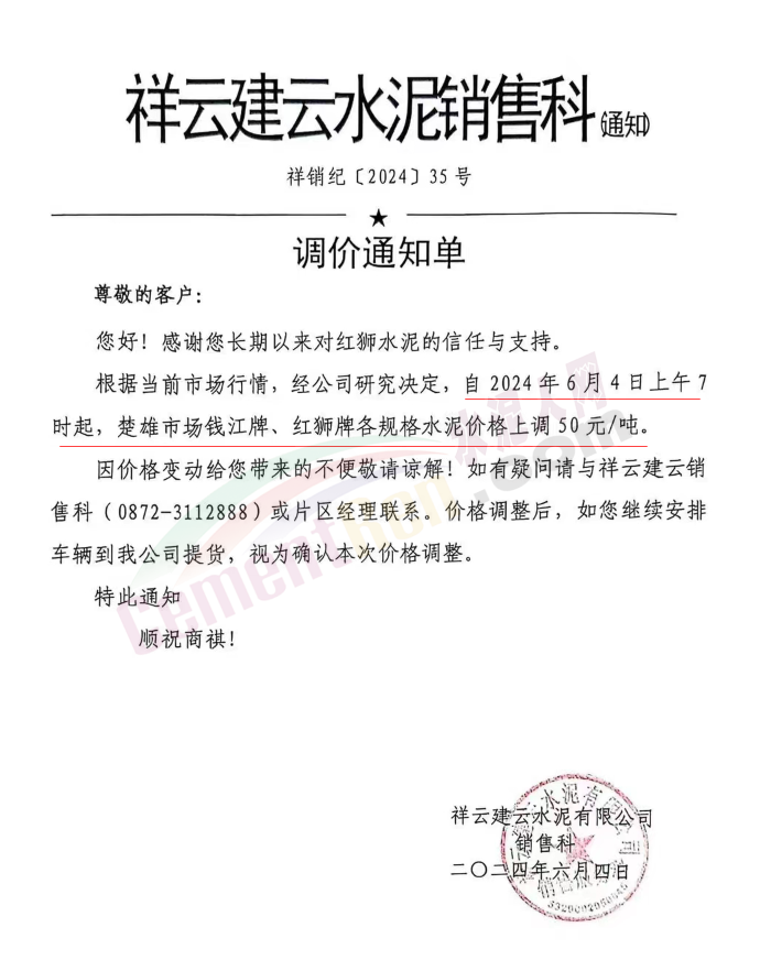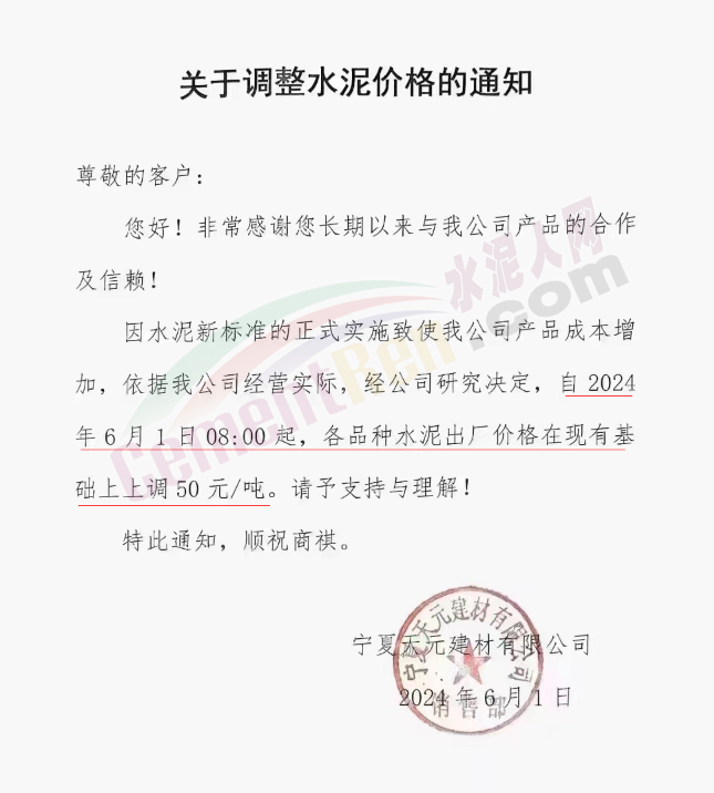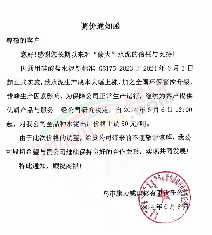 內(nèi)蒙古自治區(qū)烏審旗力威建材有限責(zé)任公司通知,因通用硅酸鹽水泥新標(biāo)準(zhǔn)GB175-2023于2024年6月1日起正式實施,致水泥生產(chǎn)成本大幅上漲,加之全國環(huán)保管控升級錯峰生產(chǎn)因素影響,為保障公司正常生產(chǎn)運行,繼續(xù)為客戶提供優(yōu)質(zhì)產(chǎn)品與服務(wù)。經(jīng)公司研究決定,自2024年6月6日12時起,對公司全品種水泥出廠價格上調(diào)50元/噸。