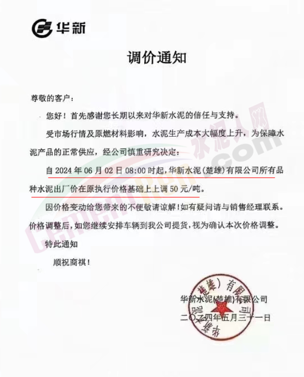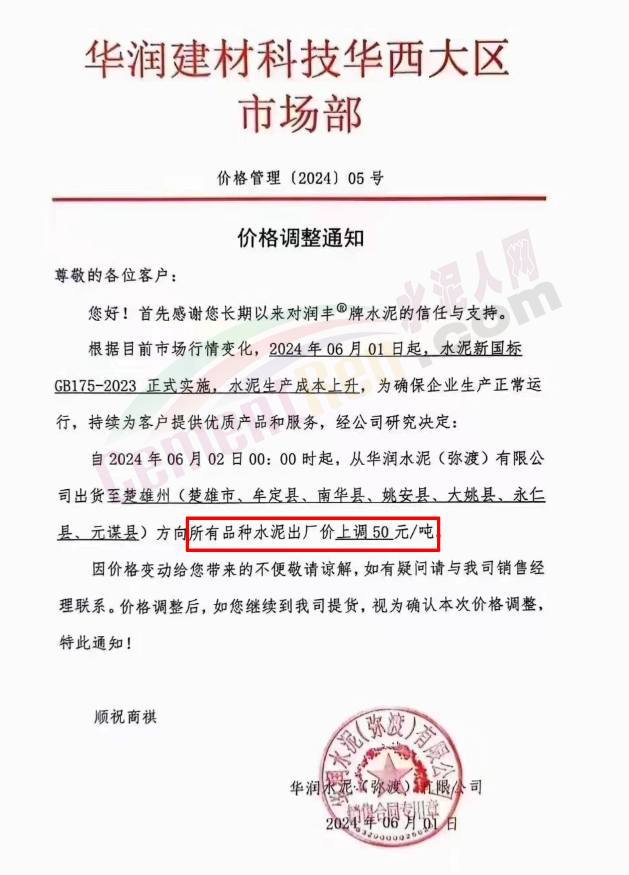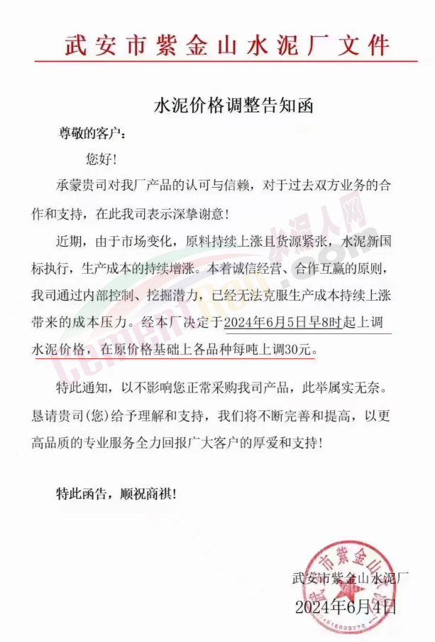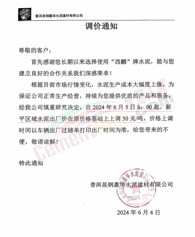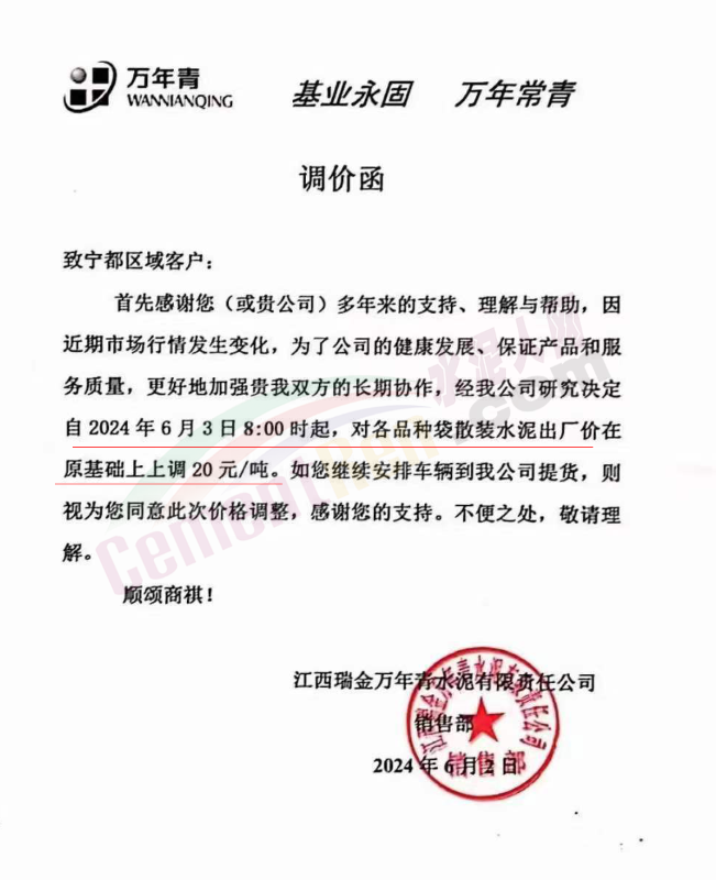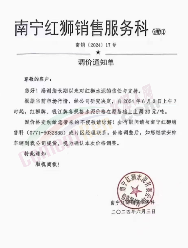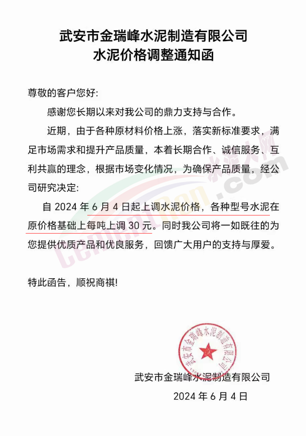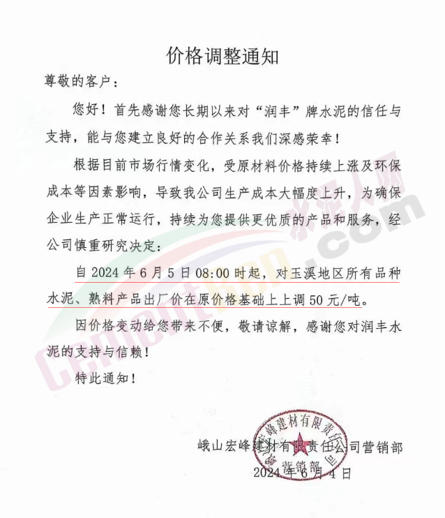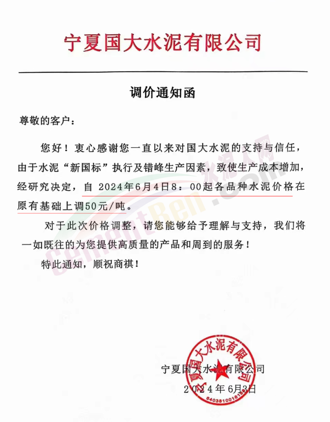 內(nèi)蒙古自治區(qū)烏審旗力威建材有限責(zé)任公司通知,因通用硅酸鹽水泥新標(biāo)準(zhǔn)GB175-2023于2024年6月1日起正式實施,致水泥生產(chǎn)成本大幅上漲,加之全國環(huán)保管控升級錯峰生產(chǎn)因素影響,為保障公司正常生產(chǎn)運行,繼續(xù)為客戶提供優(yōu)質(zhì)產(chǎn)品與服務(wù)。經(jīng)公司研究決定,自2024年6月6日12時起,對公司全品種水泥出廠價格上調(diào)50元/噸。