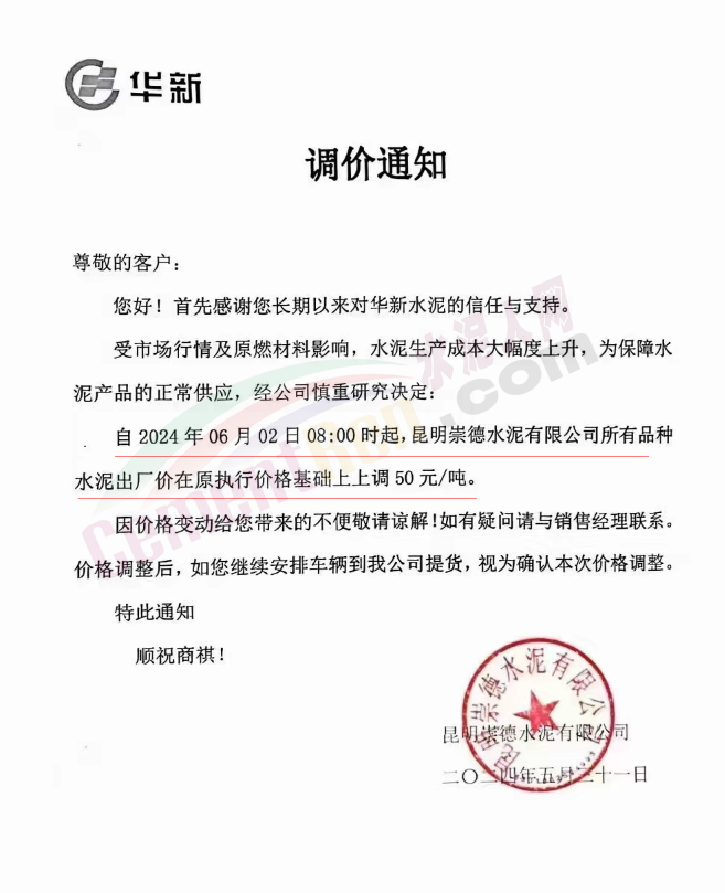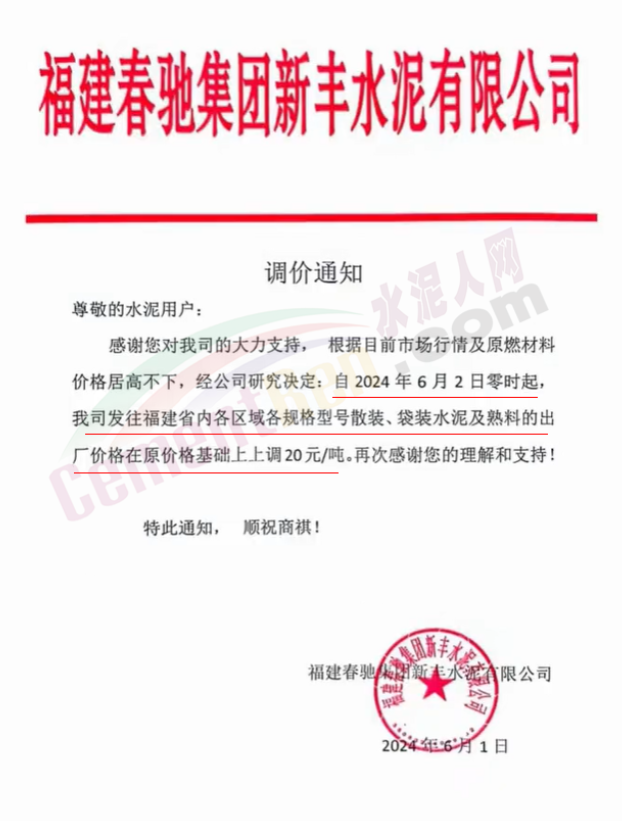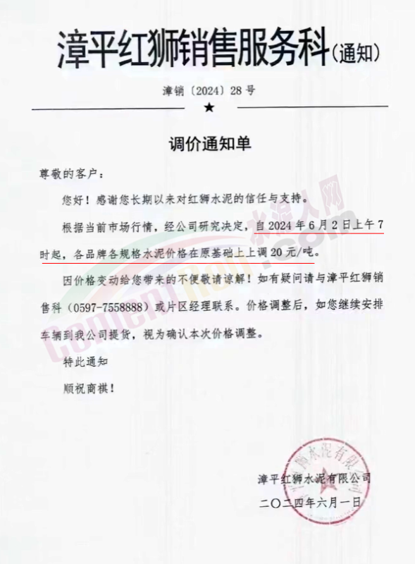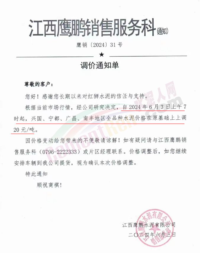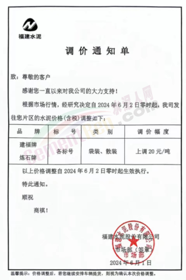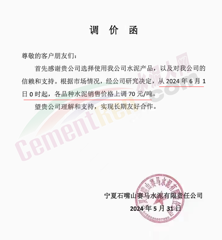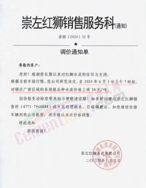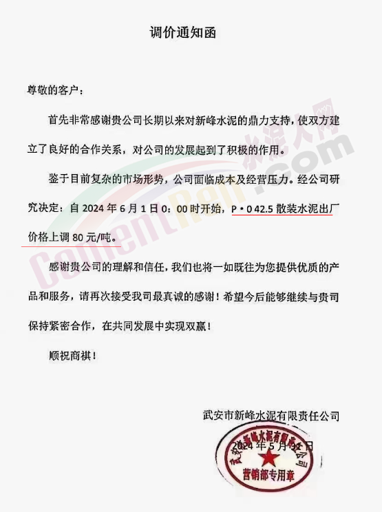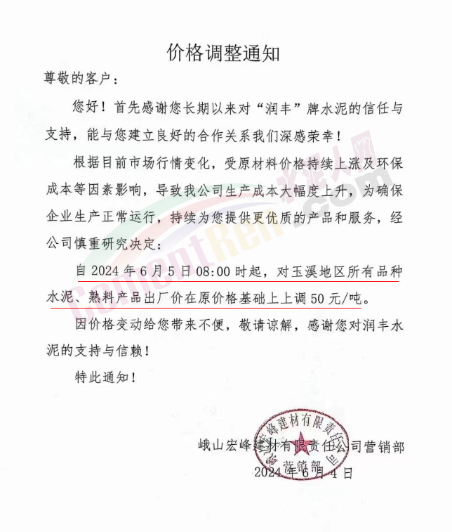 內(nèi)蒙古自治區(qū)烏審旗力威建材有限責(zé)任公司通知,因通用硅酸鹽水泥新標(biāo)準(zhǔn)GB175-2023于2024年6月1日起正式實施,致水泥生產(chǎn)成本大幅上漲,加之全國環(huán)保管控升級錯峰生產(chǎn)因素影響,為保障公司正常生產(chǎn)運行,繼續(xù)為客戶提供優(yōu)質(zhì)產(chǎn)品與服務(wù)。經(jīng)公司研究決定,自2024年6月6日12時起,對公司全品種水泥出廠價格上調(diào)50元/噸。