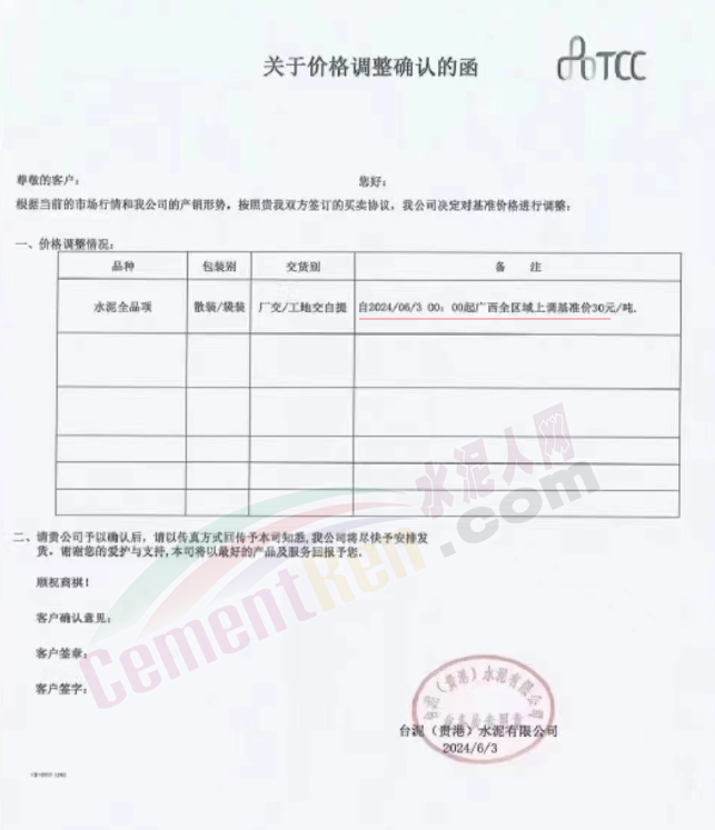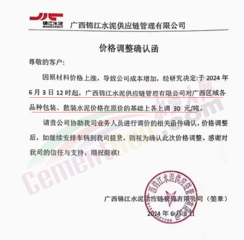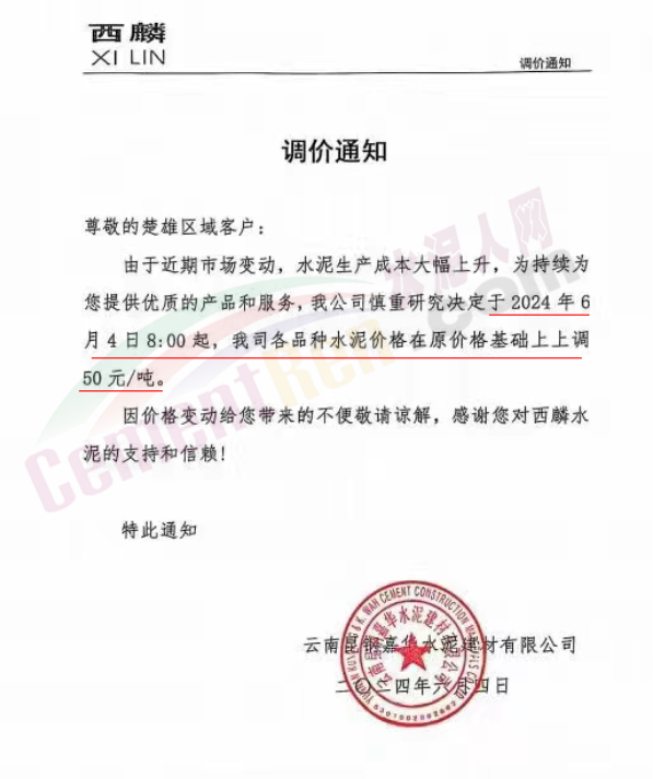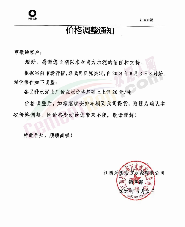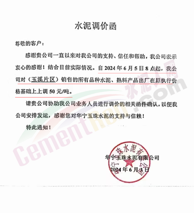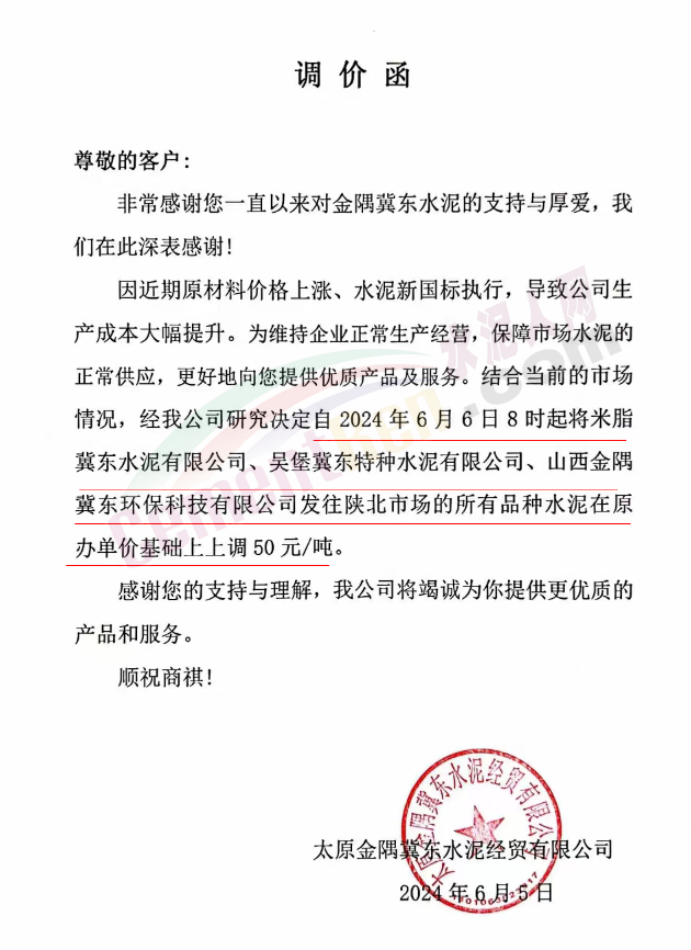 太原金隅冀東水泥經(jīng)貿(mào)公司通知,因近期原材料價格上漲、水泥新國標(biāo)執(zhí)行,導(dǎo)致公司生產(chǎn)成本大幅提升。為維持企業(yè)正常生產(chǎn)經(jīng)營,保障市場水泥的正常供應(yīng),結(jié)合當(dāng)前的市場情況,經(jīng)公司研究決定自2024年6月6日8時起將米脂冀東水泥有限公司、吳堡冀東特種水泥有限公司、山西金隅冀東環(huán)??萍加邢薰景l(fā)往陜北市場的所有品種水泥在原辦單價基礎(chǔ)上上調(diào)50元/噸。