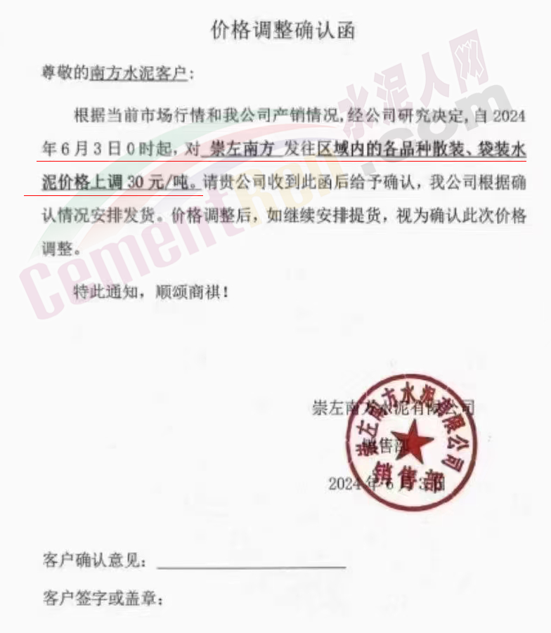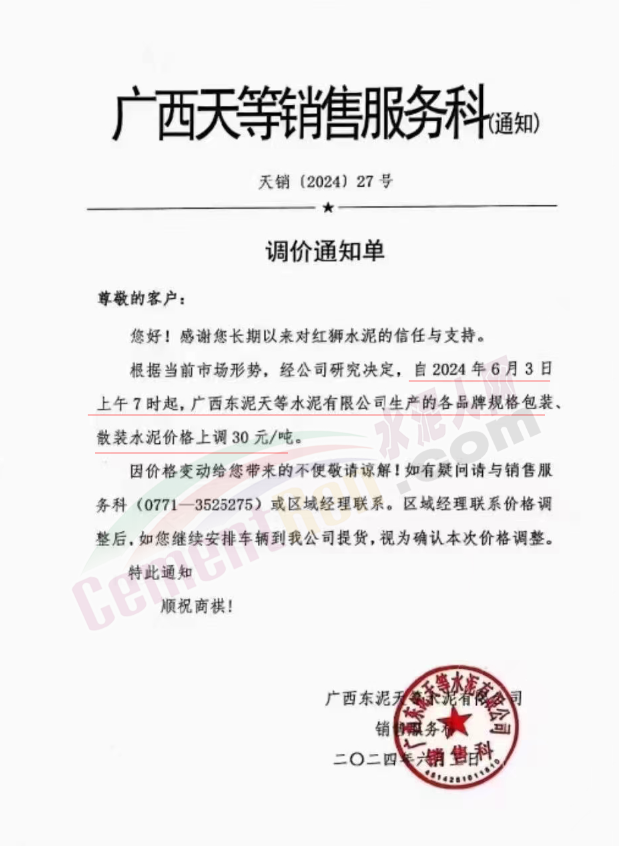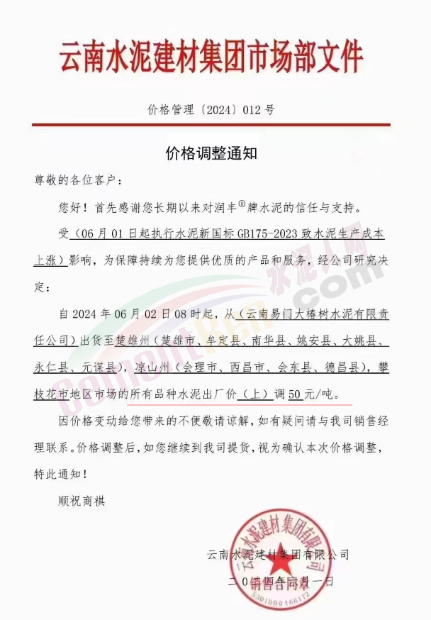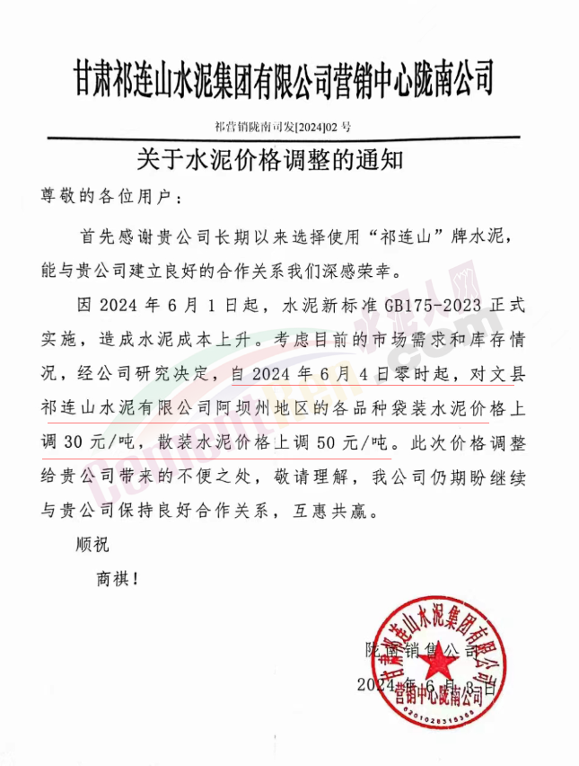 甘肅祁連山隴南公司通知,因2024年6月1日起,水泥新標(biāo)準(zhǔn)GB175-2023正式實施,造成水泥成本上升??紤]目前的市場需求和庫存情況,經(jīng)公司研究決定,自2024年6月4日零時起,對文縣祁連山水泥有限公司阿壩州地區(qū)的各品種袋裝水泥價格上調(diào)30元/噸,散裝水泥價格上調(diào)50元/噸。