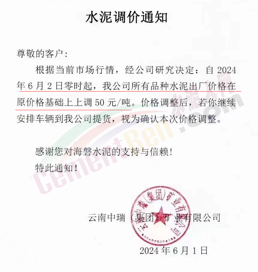 云南多家企業(yè)通知所有品牌水泥、熟料價格上調(diào)50元/噸。