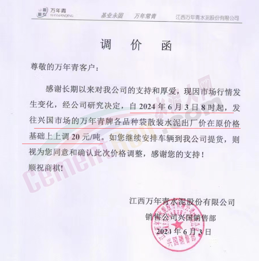 江西區(qū)域主要品牌企業(yè),于6月10日起錯峰停窯10天。區(qū)域內(nèi)多家企業(yè)通知上調(diào)水泥報價20~50元/噸