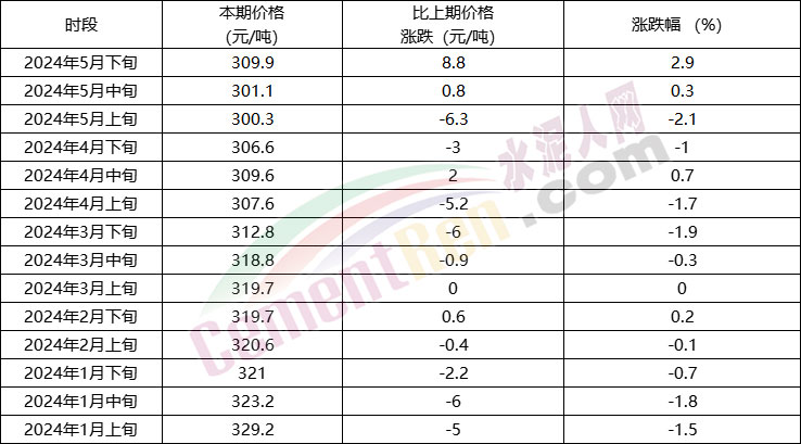 從近期國家統(tǒng)計局公布的數(shù)據(jù)可見2024年5月下旬流通領(lǐng)域普通硅酸鹽水泥(P.O42.5散裝)水泥報價309.9元/噸,較5月中旬上調(diào)了8.8元/噸,環(huán)比上漲2.9%。盡管已創(chuàng)造了年內(nèi)最大漲幅,但實際價格仍在300元/噸左右;普通硅酸鹽水泥(P.O42.5袋裝)水泥報價360.6元/噸,上調(diào)1.4元/噸,環(huán)比漲幅0.4%,與上年同期360.3元/噸的報價仍有50.4元/噸的差距。