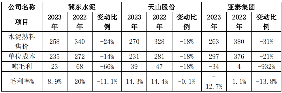 2023年受市場(chǎng)有效需求偏弱影響,產(chǎn)品價(jià)格大幅下降,公司水泥及熟料售價(jià)258元/噸,較同期下降82元/噸,同比降低24%;銷量9,324萬噸,較同期增加636萬噸,同比增幅7%。受供給過剩、有效需求不足兩端影響,公司主要生產(chǎn)線所在的華北地區(qū)、東北地區(qū)水泥價(jià)格呈現(xiàn)總體下降態(tài)勢(shì),即使在二季度旺季,亦未出現(xiàn)明顯反彈。華北、東北地區(qū)水泥價(jià)格下調(diào)幅度均超過100元/噸,跌幅分別為20%和21.8%。水泥及熟料售價(jià)大幅降低導(dǎo)致公司營(yíng)業(yè)收入同比下降18.26%,與同行業(yè)可比公司披露的數(shù)據(jù)對(duì)比,公司營(yíng)業(yè)收入降幅符合行業(yè)趨勢(shì)。