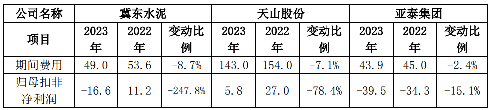 2023年扣非后歸母凈利潤(rùn)-16.56億元,同比減少27.75億元,降幅為247.84%;利潤(rùn)總額-19.01億元,同比減少37.2億元,降幅為204.35%,其中:水泥及熟料售價(jià)同比降低82元/噸,影響利潤(rùn)減少76.5億元;單位綜合成本同比下降37元/噸,影響利潤(rùn)增加34.5億元;銷量同比增加636萬噸,影響利潤(rùn)增加4.3億元;期間費(fèi)用48.96億元,較同期減少4.64億元,影響利潤(rùn)增加4.64億元。