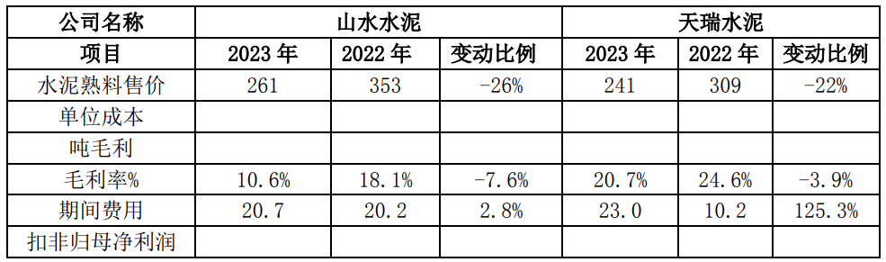 注:山水水泥、天瑞水泥2023年暫未披露水泥及熟料單位成本、噸毛利及扣非歸母凈利潤(rùn)相關(guān)信息。