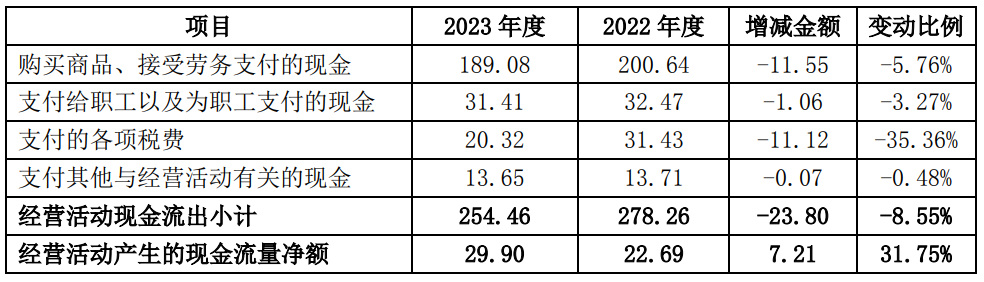 回復(fù):2023年公司實(shí)現(xiàn)營(yíng)業(yè)收入282.35億元,同比下降18.26%;凈利潤(rùn)-17.48億元,同比下降224.28%;經(jīng)營(yíng)活動(dòng)產(chǎn)生的現(xiàn)金流量?jī)纛~29.9億元,同比增加31.75%,主要原因?yàn)橥ㄟ^持續(xù)推進(jìn)精細(xì)化管理,合理控制存貨庫(kù)存,優(yōu)化調(diào)整采購(gòu)付款節(jié)奏,支付的各項(xiàng)稅費(fèi)同比減少,進(jìn)一步減少經(jīng)營(yíng)資金的支出,使經(jīng)營(yíng)活動(dòng)現(xiàn)金流量得到了一定的改善。公司經(jīng)營(yíng)活動(dòng)現(xiàn)金流量明細(xì)見下表: