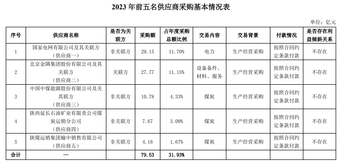回復(fù):2023年度,前五名供應(yīng)商合計(jì)采購(gòu)金額為79.53億元,占年度采購(gòu)總額比例為31.93%,其中關(guān)聯(lián)方采購(gòu)金額為27.77億元,占年度采購(gòu)總額比例為11.15%。與關(guān)聯(lián)方發(fā)生的采購(gòu)主要為采購(gòu)機(jī)械設(shè)備及備件、設(shè)備維修服務(wù)等,所發(fā)生的關(guān)聯(lián)交易均履行了必要的審議程序及信息披露義務(wù),且實(shí)際發(fā)生的交易金額均在公司董事會(huì)及股東大會(huì)批準(zhǔn)的額度內(nèi),不存在利益傾斜情形。前五名供應(yīng)商的基本情況見下表: