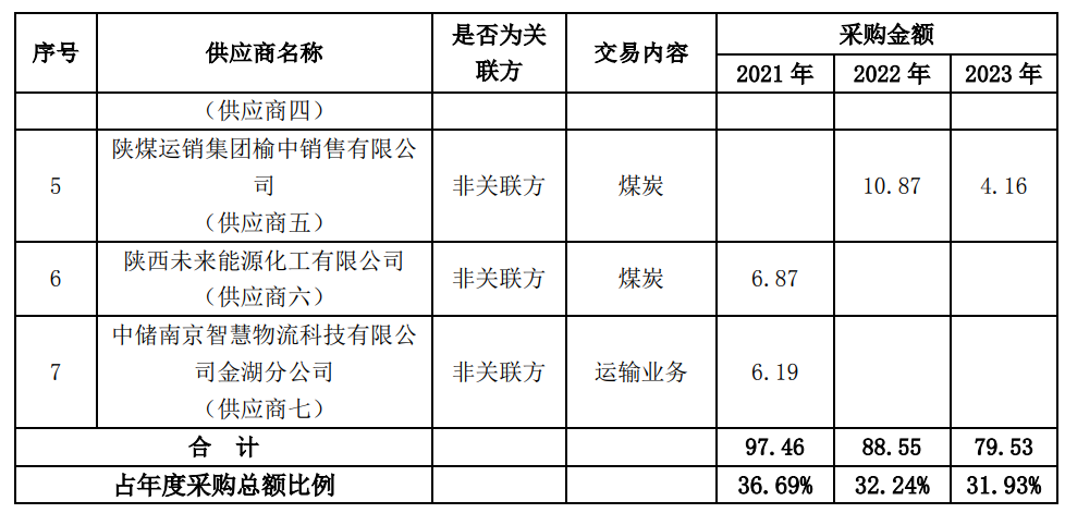 2023年公司前五名供應(yīng)商中供應(yīng)商三、四、五為煤炭供應(yīng)商合計(jì)采購(gòu)金額為22.61億元,占年度采購(gòu)總額的9.08%,占公司全部煤炭采購(gòu)份額的28%左右,三家煤炭供應(yīng)商分別約占公司全部煤炭采購(gòu)份額的13、10%、5%;公司始終秉承公平公正的原則,推行煤炭統(tǒng)采、直采,注重采購(gòu)渠道的管理,降低采購(gòu)成本,不存在對(duì)某個(gè)供應(yīng)商有重大依賴。