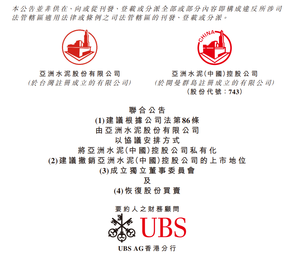 日前,亞洲水泥(中國(guó))(00743.HK)公告,要約人(亞洲水泥股份有限公司,其股份于臺(tái)灣證交所上市,并且為公司控股股東)與公司的相關(guān)董事聯(lián)合宣布,于2024年6月5日,要約人就該建議根據(jù)公司法第86條以協(xié)議安排方式將公司私有化,請(qǐng)求董事會(huì)向計(jì)劃股東提呈該建議,其中涉及注銷計(jì)劃股份,并且作為注銷該等股份的代價(jià),就每股計(jì)劃股份以現(xiàn)金向計(jì)劃股東支付要約價(jià),以及撤銷股份于香港聯(lián)交所的上市地位。