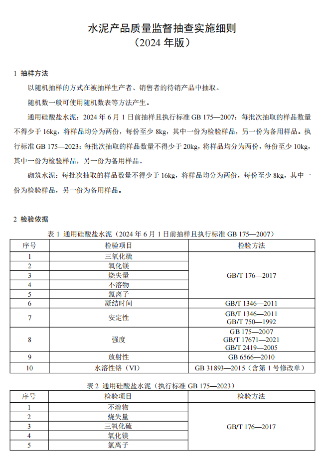 日前,國家市場監(jiān)督管理總局發(fā)布服務(wù)器等147種產(chǎn)品質(zhì)量監(jiān)督抽查實施細則的公告,其中包括《水泥產(chǎn)品質(zhì)量監(jiān)督抽查實施細則(2024年版)》。