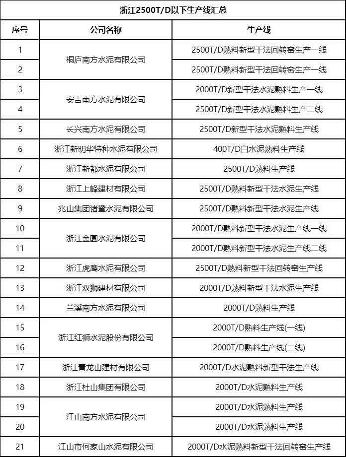 據(jù)浙江省工信廳公布的《水泥熟料生產(chǎn)線清單》顯示,截至到2023年12月31日,浙江省2500t/d及以下熟料生產(chǎn)線共計21條。