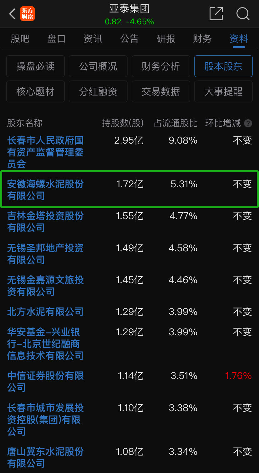 截至6月25日,亞泰集團(tuán)已經(jīng)連續(xù)4個(gè)交易日股票收盤價(jià)低于1元,亞泰集團(tuán)的股價(jià)持續(xù)下滑牽動(dòng)著海螺水泥的神經(jīng)。據(jù)公開消息顯示,海螺水泥是亞泰集團(tuán)的第二大股東,持股比例為5.31%,總持股數(shù)為1.72億股。