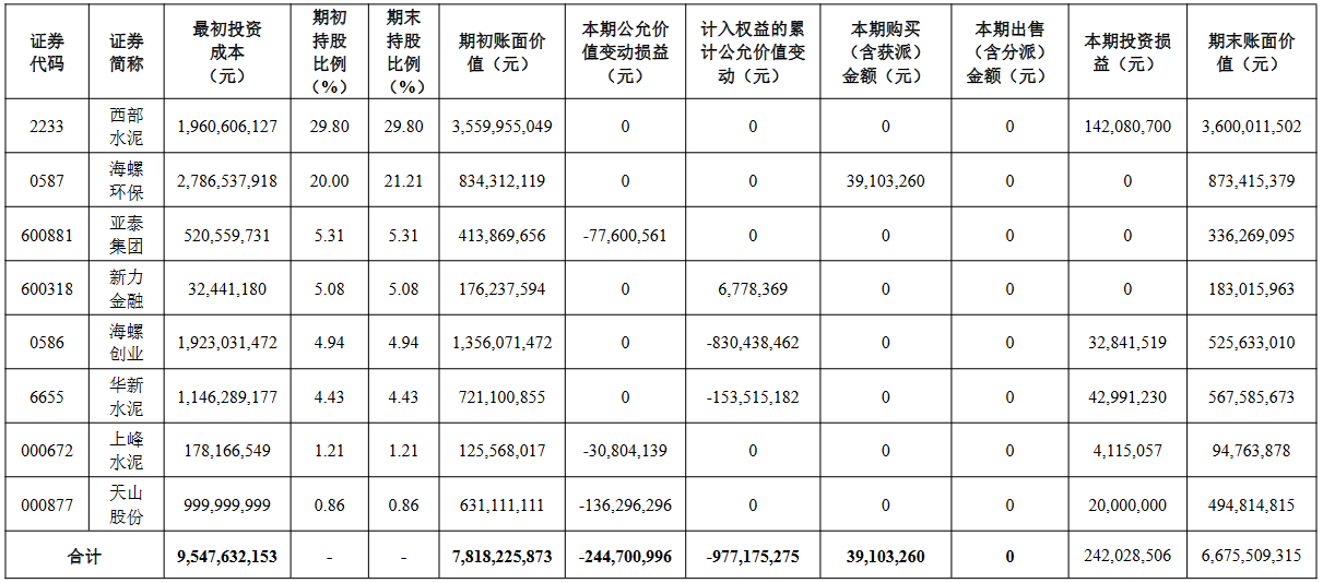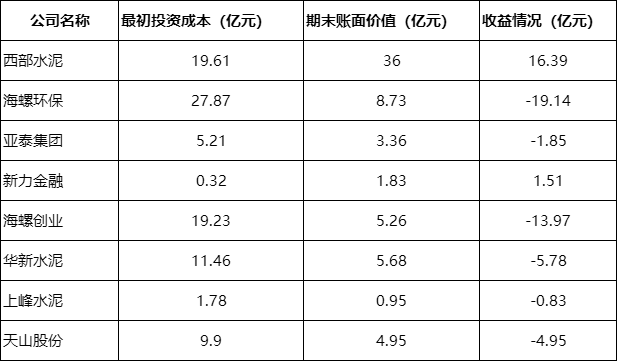 從投資的企業(yè)來(lái)看,僅西部水泥和新力金融屬于正收益,總收益17.9億元,而投資的海螺環(huán)保、亞泰集團(tuán)、海螺創(chuàng)業(yè)、華新水泥、上峰水泥、天山股份累計(jì)虧損46.52億元。