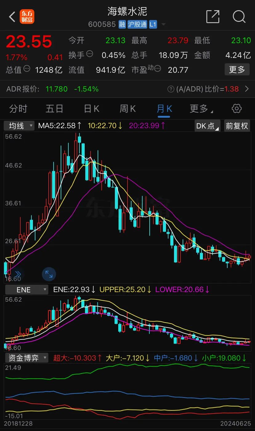 截至2024年6月25日,海螺水泥的股票最低價(jià)為23.1元/股,市值為1244億元“,而較2020年7月31日的歷史最高值56.62元/股,總市值3000.29億元,股價(jià)下跌59%,總市值蒸發(fā)1756.29億元。