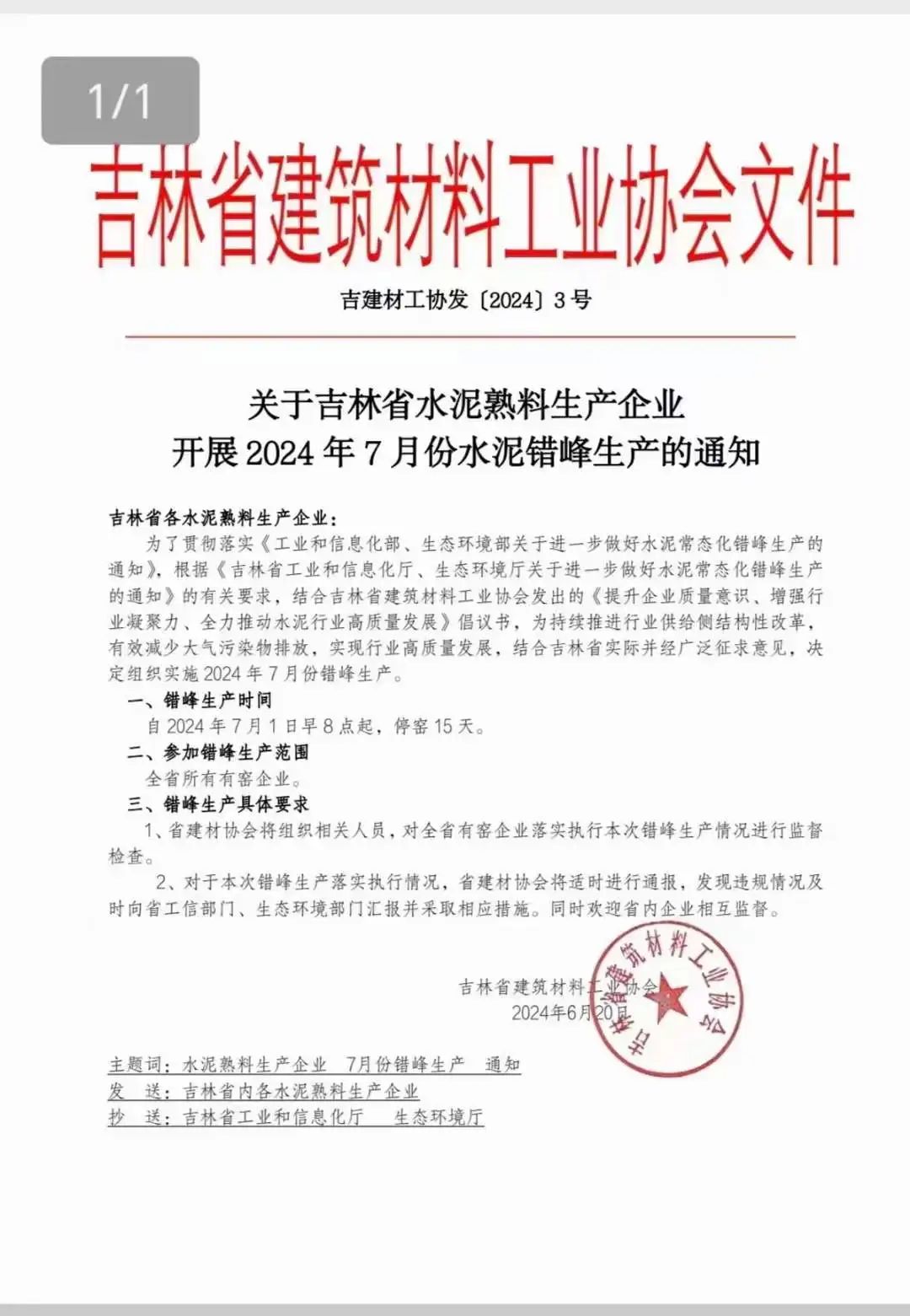 近日,吉林省建筑材料工業(yè)協(xié)會(huì)發(fā)布《關(guān)于吉林省水泥熟料生產(chǎn)企業(yè)開(kāi)展2024年7月份水泥錯(cuò)峰生產(chǎn)的通知》稱(chēng):自2024年7月1日早8點(diǎn)到起,全省所有窯線(xiàn)企業(yè)停產(chǎn)15天。